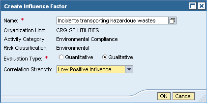 The application supports a qualitative and a quantitative evaluation type. The Correlation Strength field describes the tendency of the two risks to enforce or compensate for each other. Qualitative correlation strengths are selected from a drop-down list that you maintain by following IMG menu path GRC Risk Management > Master Data Setup > Maintain Influence Strength. If you choose the Quantitative evaluation type, you need to enter numeric values between -999.99 and 999.99 for the influence factors on impact and probability. Use negative values to document a compensating influence.
