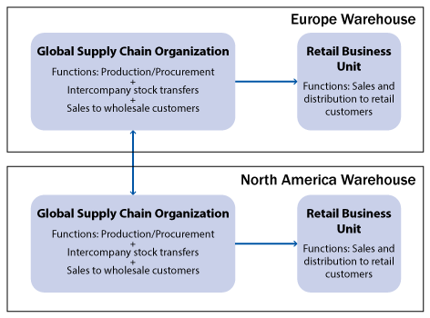 In this setup, within the geographical location, a single department handles production and logistics planning centrally to ensure the production and supply availability for the demand from intercompany, wholesale customers, and retail customers. In other words, the global supply chain organization produces or procures all the goods for all the demand that comes to Europe and then distributes them. Marketing and sales, on the other hand, are split between the wholesale and retail business organizations. Therefore, forecasting and sales processes are separate for the wholesale and retail business units. Production or procurement is based on the forecast sales in the wholesale and retail organizations as well as the intercompany demand across the geographical location.