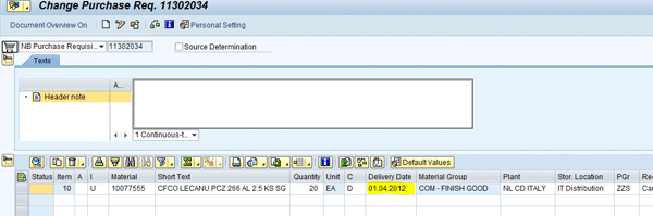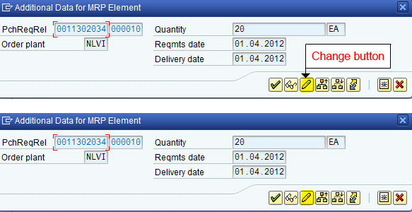 To revise the date in the stock transport requisition based on material availability in the production plant, double-click the stock transport requisition item in transaction MD04. Click the Change button (