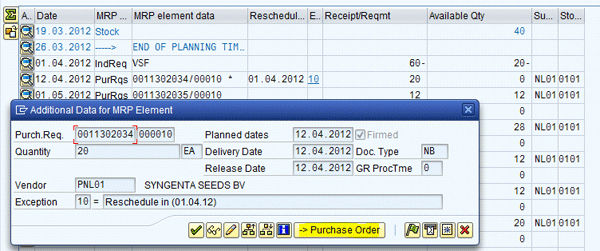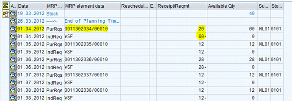 Figure 6, there’s a quantity requirement of 60 on 01.04.2012 in the virtual plant. Because there’s a stock availability of 40, the stock transport requisition is generated for 20 toward the production plant.