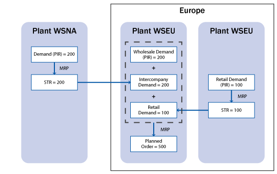 If there is any intercompany demand for the material, this data also flows into WSEU through MRP. The North American wholesale plant is WSNA, so the demand data from the plant WSNA flows into European plant WSEU as intercompany demand (MRP Element PrqRel) through the stock transport requisition generated in plant WSNA. Therefore, the total demand flows into plant WSEU for all markets, thereby enabling the planners to make the production or procurement proposal centrally (