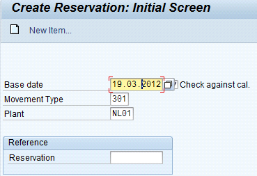 2. Enter the base date as the date when the material becomes available in the distribution plant (e.g., 19.03.2012). Enter the movement type 301, which is the plant-to-plant transfer, and then the code for the production plant (e.g., NL01) as shown in