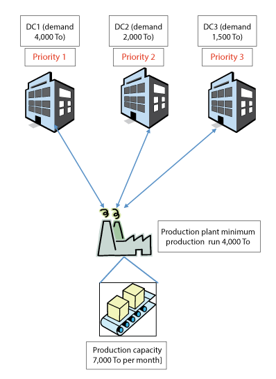 Consider a simple supply chain with three distribution centers all placing a stock transfer demand on a production facility for a single product (Figure 1). For simplicity, the following assumptions are made: