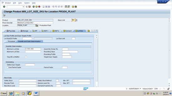 Lastly, the product master is updated with the Minimum Lot Size of 4,000 To as shown in Figure 6. To access the data on this screen execute transaction code /SAPAPO/MAT1 or follow menu Path APO > Master Data > Product > Product.