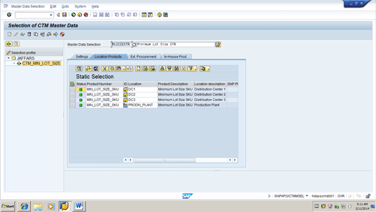 The starting point is a CTM run that plans product Min_LOT_SIZE_SKU at three warehouses: DC1, DC2, and DC3. The production plant is PRODN_PLANT. Figure 3 shows the master data selection for the Location Products to be planned.To access this data execute transaction code /SAPAPO/CTMMSEL or follow menu path Multilevel Supply and Demand Matching>Environment>Master Data Selection.