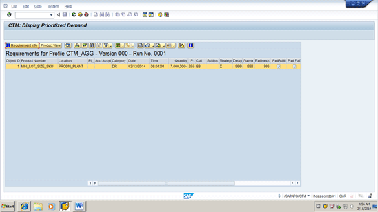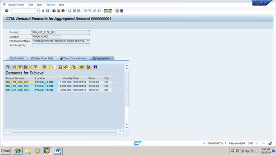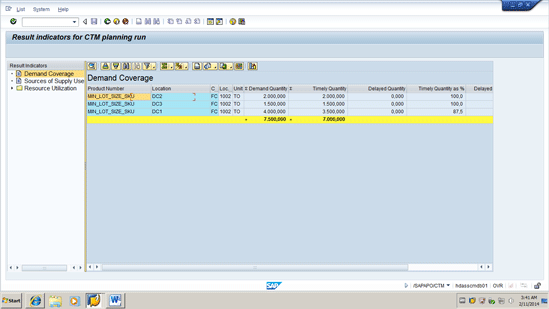 Step 3.Execute a CTM run for the Aggregated Stock Transfer Demand with minimum lot size switched on. With the planned order deleted, the production location has only the stock transfer demands. These are aggregated in the CTM run so that they are planned as one demand. The planning is done with the minimum lot size switched on. The result is that you have capacity fully utilized and the minimum lot size constraint applied.