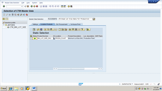 Now you execute a new CTM run using a CTM profile that has only the production location specified in the master data selection (Figure 15). The rationale is that in the CTM run only the demand in the production location is planned. The demands are the STR demands and these should be planned using the minimum lot size.The Master Data selection is accessed via transaction code/SAPAPO/CTMMSEL or by following menu path Multilevel Supply and Demand Matching > Environment > Master Data Selection.
