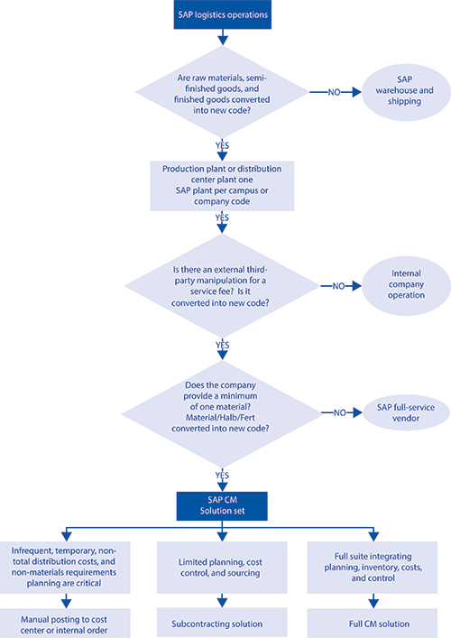 Figure 1 shows a business process decision flow that could help you in choosing the appropriate contract manufacturing solution, saving resources and time. The sections that follow detail the master and transactional data required for each. Note that the configuration for the subcontracting solution is more extensive than the configuration for the manual posting solution.