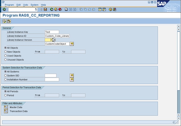 Click Call Ad-Hoc Reporting under Common Tasks to produce the screen in Figure 3. The tool provides comprehensive reporting functionality for master and transaction data. The reporting capability can save variants to the database that can be automatically filled in a selection screen (Figure 3). In the General section in the upper part of the screen, it is important to fill in the library fields, such as Key, ID, and Version, to have the related results. Only one library can be active at a time.