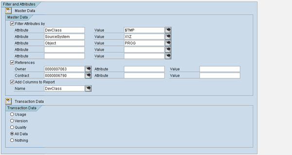 The first filter allows limiting the result list by filtering of master data attributes such as Development Class, Source System, or Object (Figure 4). You can select the available attributes via an input help by pressing F4. The remaining fields labeled Value do not offer an input help. Figure 4 gives an example of how a filter selection of attributes and values could be done. Each attribute can have more than one filter value filled in at a time. In addition, there are input helps for the references, such as contract and owner. For both key values, the corresponding names are displayed with the corresponding ID.