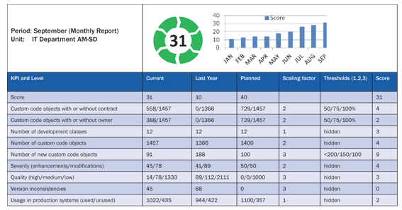 Finally, all scores are needed as part of the calculation to get the overall total and final score. For example, the number of custom code objects that have the attribute Contract is 558 and the planned goal is 729. That means that more than 75 percent of the objects have been maintained. Therefore, two points are multiplied by a scaling factor of two, making four. The scaling factor is necessary to prioritize the more important figures over the less important ones, and is done together with the thresholds. The result is that you can calculate a three-, two-, or one-point contribution to the score for each row.