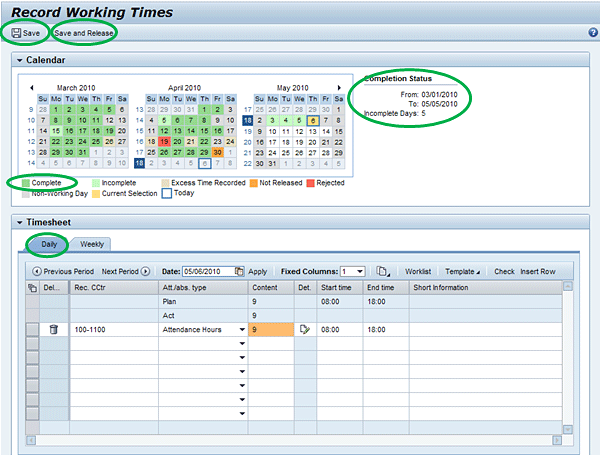 - Improvement: Adding a complete calendar category. SAP added a new category in the calendar called complete, indicating that recorded hours are equal to target hours. Target hours are set by a person’s work schedule (infotype 0007) and are typically done in the backend. Having this simple feature makes it easy for time-writers to understand that his or her entry is complete for the day. This demonstrates the get-to-it and obvious categories of the application.