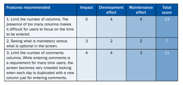 - Duplicative and unnecessary columns. Although entering comments is a requirement for many time users, the screen looks very crowded when each day is has a new column just for entering a comment.
