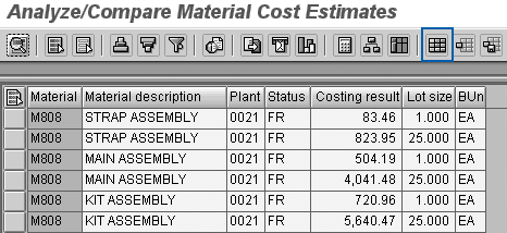 When analyzing production costs for any products, however, a list display can be more useful (i.e., one product per row, with cost components as columns). Figure 2 shows a standard report that displays a list of cost estimates for many products using transaction code S_P99_41000111.