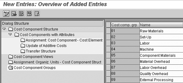 You can assign two cost component groups to each cost component if required. Only one assignment is usually necessary, as shown in this example. After assigning all the cost component groups and saving, remember to activate again the cost component structure you deactivated in Figure 5.