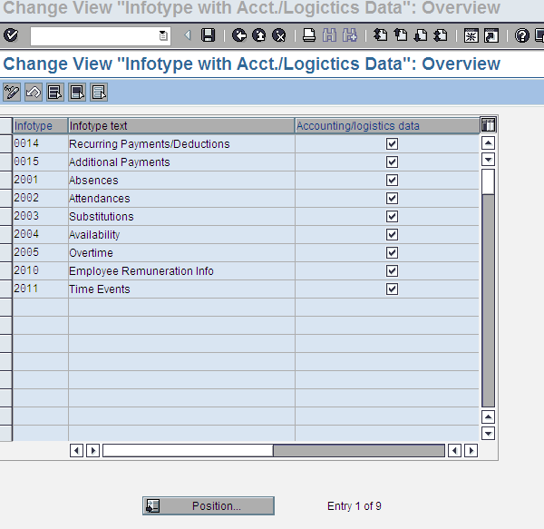 Next, check the Accntng/log.data check box. If it is not selected, click the check box to activate it and then click the save icon. This step makes the infotype eligible for entry of additional controlling objects, such as cost assignment and activity allocation.
