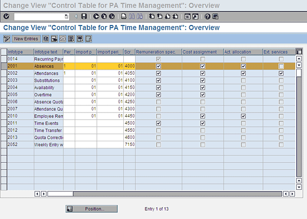 In Figure 5 if you look at the selected line (infotype 2001 [Absences]), you see that the check boxes for Remuneration spec (specification), Cost assignment, and Act. (activity) allocation are checked, but the Ext. (external) services check box is not.