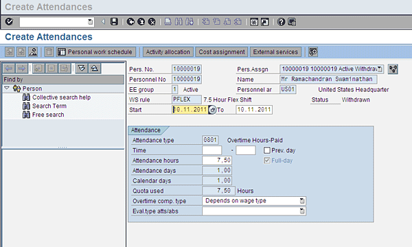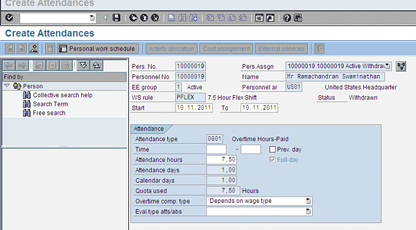 Infotype 2002 (attendances) screen before the SAP system applications integration