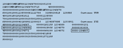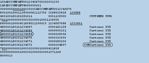 ABC Company designed the customized format program to remove any alpha characters from the invoice or reference document number field on the bank’s lockbox file. This facilitates the matching process, because in R/3, document numbers are only numeric. Note the conversion of the negative sign "-"and the deletion of unwanted alpha character "A" by comparing Figures 1 and 2.