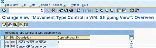 Next, set the movement type control indicator for warehouse Movement Type 101 to 4 as shown in Figure 13 in the Copy WM quantity column. The movement type control Indicator 4 posts the goods receipt for the transfer order when confirmed. This indicator ensures that the WM quantity (i.e., the transfer order quantity), is used for the goods receipt positing. This setup, along with single line transfer order creation, ensures that multiple goods receipts can be posted against the inbound delivery note and that each putaway is immediately available for picking.