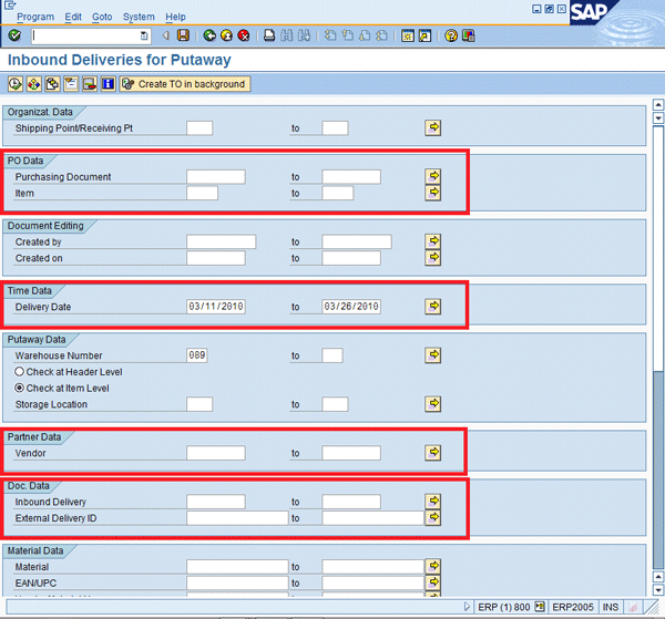Inbound delivery selection screen for putaway