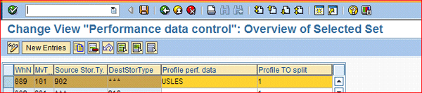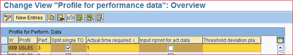 Step 2. Assign the Split Profile to the Warehouse Activity Area. To assign the Split Profile to a warehouse process, follow IMG menu path Logistics Executions >Warehouse Management > Activities > Processing Performance Data/TO Split > Control for Performance Data Processing/Define TO Split.