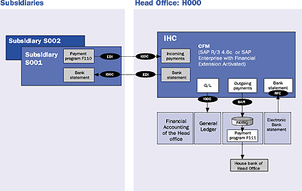 Communication between the in-house cash center and the head office is provided by BAPIs and RFCs. The BAPI carries the payment information from the IHC center to the head office as a payment request automatically. When the head office imports the bank statement information, the payment information is carried to the IHC cash center by RFC. See the figure for the technical architecture of IHC.