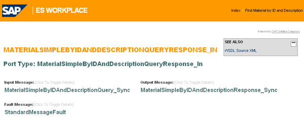 Figure 10. You can expand each message type using the toggle option. You can further expand each field level by clicking the brackets to display all technical detail information to the parameter levels. To know more about the technical details of parameters, you can navigate further to find more on base type, detail description, and permitted value ranges. For example, if you were to navigate the Find Material by ID and Description Web service, you would discover that this Web service is designed to request information based on material IDs and material description. The input message provides a facility to include or exclude single or multiple values or a range of single values or multiple values with wild card, e.g., an asterisk (*), for a request. If a request is successfully processed, output messages provide records that have material IDs and material language with specific descriptions and other material attributes that match the input request criteria.) In addition to this, output messages further provide log information on back-end processing. In case of processing failures either on a back-end system or because of connectivity problems for any reason, a fault message provides the appropriate fault detail information.