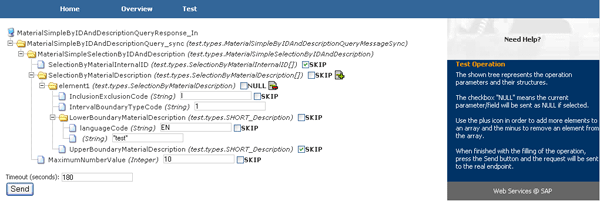 Use the Operations link to navigate to the page with the operation request parameters. Test the service to find a material list that matches the description *test*. Because you are using the description parameter to find a material list, you can skip the SelectionByMaterialInternalID node. Select the check box to the right of the SelectionByMaterialInternalID node, as shown in