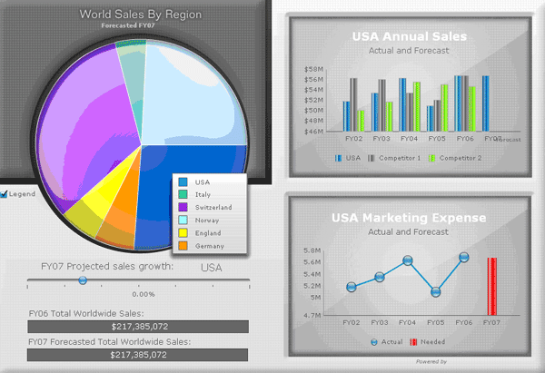 - Xcelsius 2008. Xcelsius 2008 products focus on various presentations, for example the dashboard shown in Figure 4. (Discussion of this product goes beyond the scope of this article.)