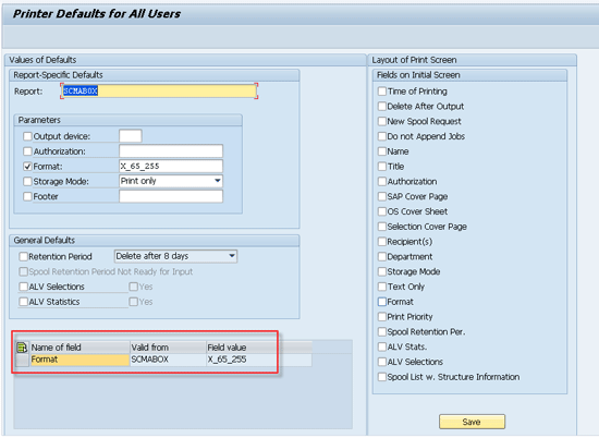 • Use two ways to change the default layout for the spool for program SCMABOX so that users see the output in a consistent way (e.g., a sufficient number of columns in output)