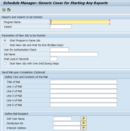 In the selection screen of program SCMABOX (Figure 4), enter the name of your custom-developed program name in the Program Name field. In case your custom-developed program has a selection screen, enter the variant in the Variant field that contains the selection screen values.