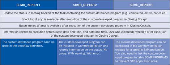 - There is a custom-developed program that is used for reporting and is a stand-alone process (e.g., a report showing changes in purchase order data). Such custom-developed programs do not need to be in a workflow. Therefore, SCMO_REPORT1 is suitable for such a custom-developed program.