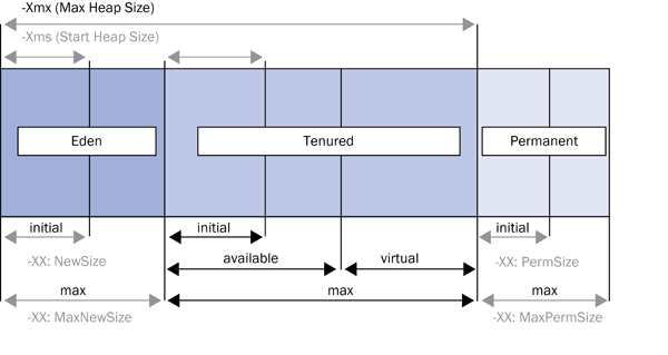 The memory is divided into three main areas, called generations: the Eden (young) generation, the tenured (old) generation, and the permanent generation (Figure 1). You use a Java administration tool called the Config Tool to configure the memory in the JVM.