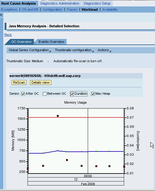 Through Java memory analysis, Solution Manager Diagnostics enables you to see how efficiently your garbage collector is performing. Follow menu path Root Cause Analysis > Workload > Java memory analysis and select the GC Overview tab (Figure 2).