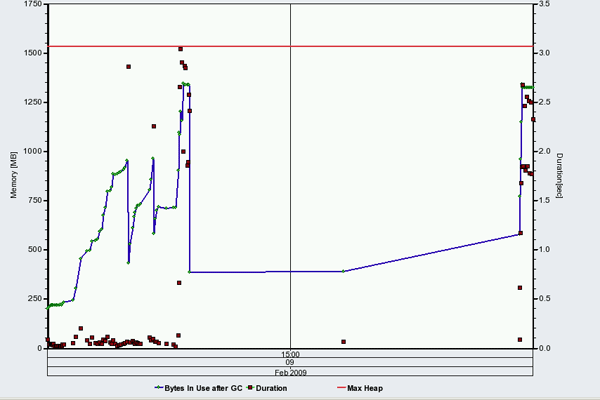 Java memory analysis provides the details on the efficiency of the garbage collection for the server node of a particular instance during a selected time frame. On a system with good performance, the Java memory analysis diagram typically looks like the screen shown in Figure 2. The red line indicates the max heap memory that is available to a particular server process. The blue line indicates the amount of max heap memory that is currently in use. The square dots indicate the garbage collections that have taken place, with their position on the chart based on their duration.