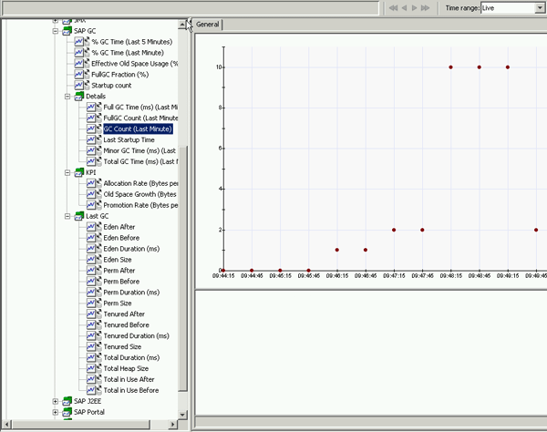 Figure 6 shows the Investigator view in Introscope WebView and all the dashboards that relate to garbage collections. You can see more detailed information about what is happening with different generations, the number of garbage collections that have taken place, and other useful KPIs. Figure 6 highlights the GC Count dashboard that shows the number of garbage collections that have taken place over a live time range (i.e., what has been happening in the system in the last minute).