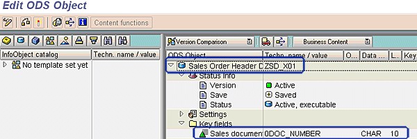 In transaction RSA1, I created a custom DSO ZSD_XO1 for sales orders header data. To view the DSO structure, double-click the object ZSD_XO1 (Figure 2). The DSO key field (InfoObject) for this extractor is 0DOC_NUMBER. You have to maintain a 1-to-1 relationship between VBAK-VBELN and the key field 0DOC_NUMBER. After loading the data, the number of records available in source table VBAK equals the number of records in the DSO because they both have the same key field.