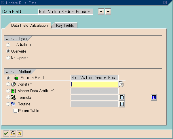 For all the key InfoObjects (such as quantity, amount, and number) of the DSO data fields, ensure that the Overwrite option is selected in the update rules when you assign the source InfoObject to the target InfoObject (Figure 3). By using the Overwrite option, you avoid having multiple records (from setup tables and from delta loads) with the same key from the same source. This ensures that you have the latest image in SAP NetWeaver BW.