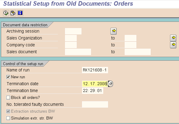 If you have voluminous data, do the setup runs for small groups of data. You can set this up in the Document data restriction area using the Sales document number ranges. For example, if you have more than three million records, it is better to split the records into groups of one and two million and run the setup for each group. For each batch, use new names for Name of run field in the Control of the setup run area.