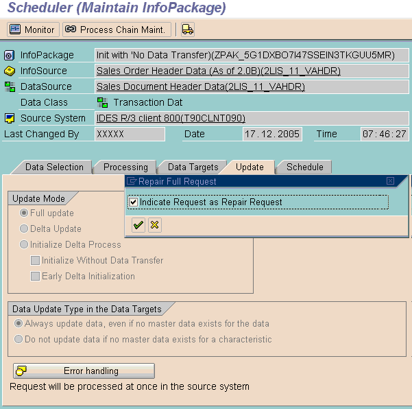 Step 5. Go back to SAP NetWeaver BW and click the InfoPackage Update tab (Figure 4). This time select Full update to pull the data from the setup tables (Figure 6). This option pulls data from the SAP ERP setup tables. Right-click the InfoPackage and select Scheduler > Repair Full Request from the context menu. In the pop-up dialog box, select the Indicate Request as Repair Request check box. These options ensure that you pull data only from setup tables.