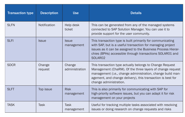 You are probably already familiar with the Service Desk in SAP Solution Manager as a help desk ticket system. However, the information in a help desk ticket varies considerably from the information needed to document, track, and resolve an issue or a change request. Fortunately, the Service Desk has more than 40 different transaction types that you can use to manage your work. Table 1 shows the transactions that I have found useful during projects and for ongoing support.