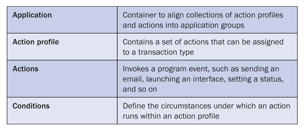 Until now, you have been building parts for a work management engine. Now it’s time to put them together and turn it on. The action profile is where the real power of the Service Desk is. You can perform activities such as automatically escalating issues based on business rules, triggering programs to run, firing interfaces to third-party tools, and communicating with SAP support services — to name a few.