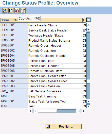 The status profile configuration is next. Follow menu path SAP Solution Manager > Scenario-Specific Settings > Service Desk > Service Desk > Status Profile. Open the Status Profile Configuration and click the Position button. Enter SLFI* and press Enter. This positions you to the SAP-delivered issue status profile. I prefer to copy SAP configuration whenever I can, and the status profile is no exception. You can avoid many potential problems with the status values by copying the SAP-delivered profile. To do this, select the SLFI0001 and click the copy icon