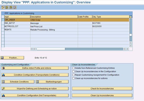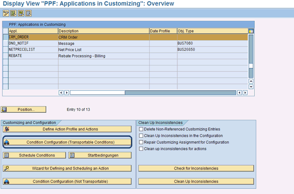 Next, you need the conditions. Action profiles and actions tell the system what to do, while the conditions tell the system when to do it. Go back to transaction SPPFCADM. Select CRM_ORDER as the application again and click the Condition Configuration (Transportable Conditions) button as shown in Figure 29.