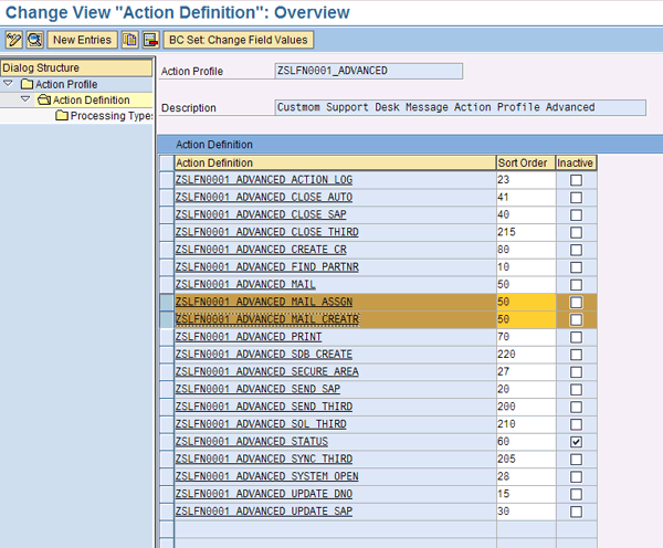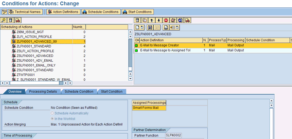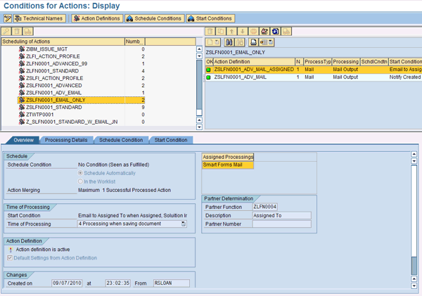 Because you want to send emails to the Assigned To party and to the Creator, you need to define actions for these activities. The simplest way is to copy the mail activity that is already in the profile. Do this by selecting ZSLFN0001_ADVANCED_MAIL (default mail action delivered by SAP) and clicking the copy icon. Note that in Figure 27 I’ve renamed the action definition and changed the partner function to point to the Assigned To party.