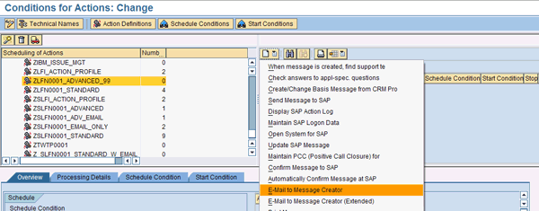 Now SAP Solution Manager knows to send emails to the Creator and Assigned to parties, but you should provide additional details as to when. First, select the action definition E-Mail Message to Creator in the right subwindow, then click the Start Condition tab in the lower subwindow. Your screen should now look like Figure 33.