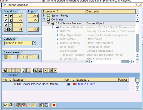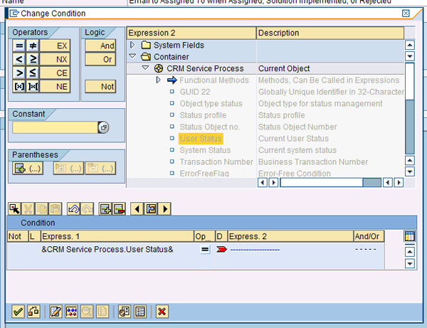 Next, I’ll show you how to add these criteria into the condition. From the Change Condition screen (Figure 37), double-click the User Status value. By double-clicking the User Status field, the condition editor adds &CRM Service Process.UserStatus& to the Express. 1 column, and the editor has moved to the Op… field. Since you want the condition to fire when the user status is equal to Assigned, you should double-click the = operator in the operator subwindow on the top left of the screen.