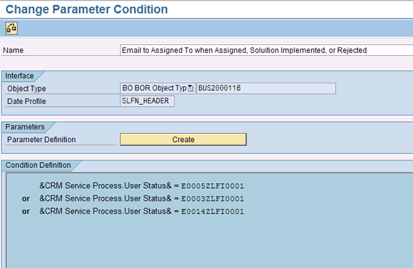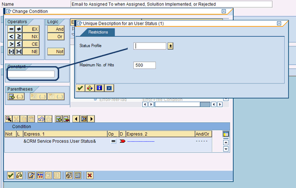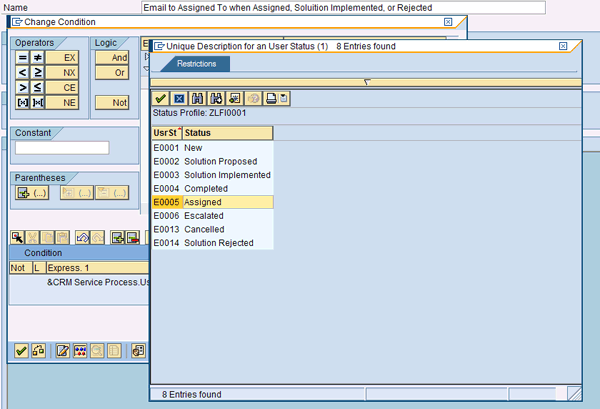 You might have noticed that the And/Or column has ----- displayed. This is where you can extend your condition rules. Because you have three possible status values that you would like to cause an email to be sent to the Assigned To party, this is an Or condition. Double-click the Or button in the Logic (from the options And, Or, and Not) section of the screen to tell SAP Solution Manager you are extending the condition.