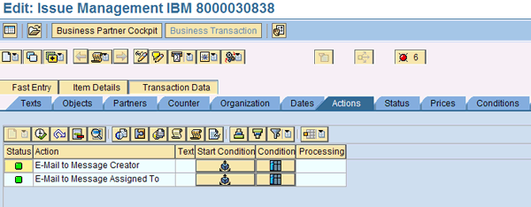 I have two business partners set up in this system, so in this example I play both the part of the Created By (business partner #142) party and the Assigned To (business partner #1) party. The Assigned status triggers an email to my #1 business partner, the Assigned To party. Click the Transaction Data tab and then the Actions tab to review the action log for this transaction (Figure 2). Note that the E-Mail to Message Creator has a yellow triangle beside it. This indicates that the conditions to send the email to the creator have not been met.